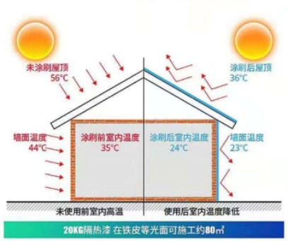 根據(jù)建筑節(jié)能體系計(jì)算,大量試驗(yàn)結(jié)果表明,當(dāng)太陽(yáng)反射率和半球發(fā)射率為0.80時(shí),反射隔熱涂料具有明顯的隔熱保溫性能,例如:以南京地區(qū)氣候?yàn)榇恚寒?dāng)太陽(yáng)反射率和半球發(fā)射率為0.80時(shí),反射隔熱涂料等效熱阻可以達(dá)到0.16~0.20m2K/W(根據(jù)朝向、基層墻體不同有區(qū)別),以廣州地區(qū)氣候?yàn)榇恚寒?dāng)太陽(yáng)反射率和半球發(fā)射率為O.80時(shí),反射隔熱涂料等效熱阻可以達(dá)到0.15~0.28m2K/W(根據(jù)朝向、基層墻體不同有區(qū)別)。